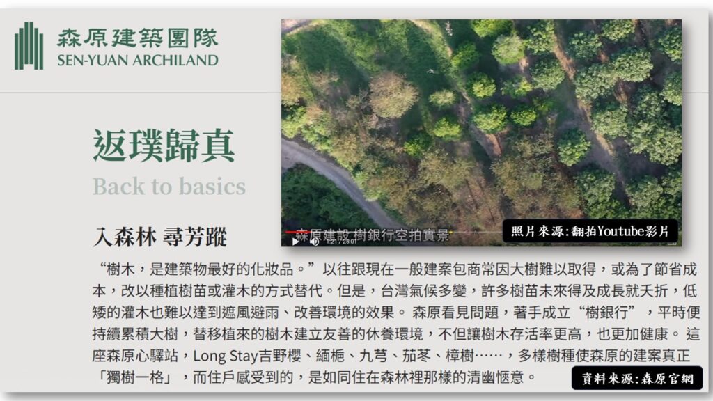 森原建設更號稱是自有的樹銀行,可以將已栽種好的大樹,待森完樹近完工後,可直接移植到這個社區.
