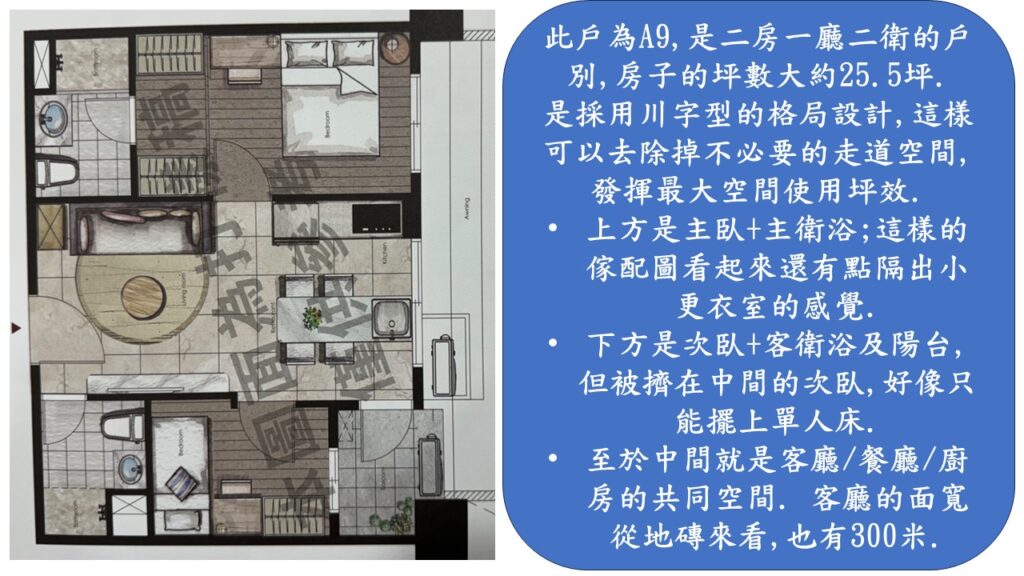 有銷售狀況來看,二房的,或者說是30坪以下的,均有很好的銷售成績.因為現在只剩下樹之丘的二房可以買,所以就拿它的二房來稍微說明一下,其中大部份為川字型的格局,真的滿受現在購屋者的喜愛.