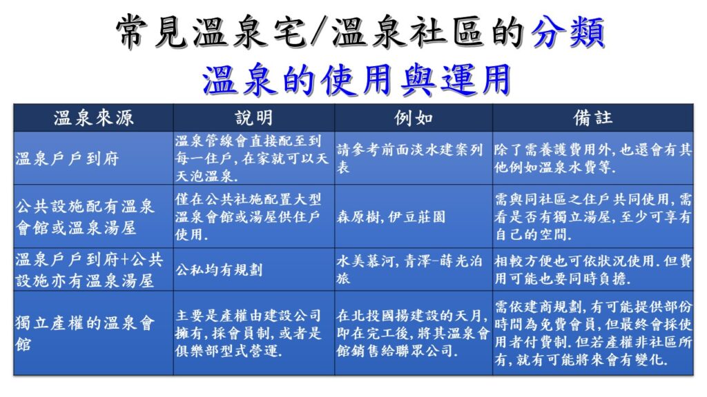 想藉由分享幾個溫泉宅各案的介紹,讓大家不僅是把目光放在溫泉而已,而是建案的大環境,包括:背景及其周遭環境狀況,交通,與未來各種發展,及對生活的影響;再看到建案本身設計的相關重點.