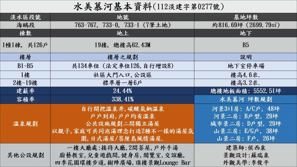 另外,與其他本區域同為溫泉宅的新建案來比,要面向正河景,又有獨立主臥湯屋,而且還要能是規劃相較較小坪數的(以總價帶來看),應該就只有水美慕河了.