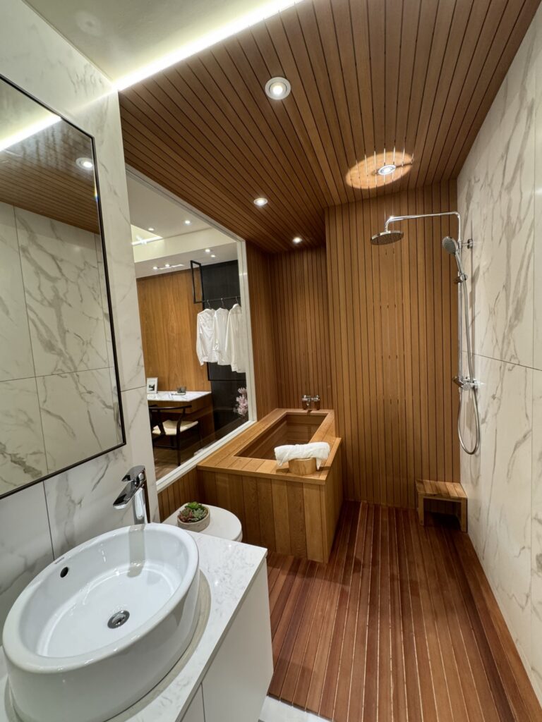 仁義哥印象非常深刻的某間位於蘇澳的一間溫泉飯店,其海景客房內的溫泉湯屋,就跟這次去參觀水美慕河看到的主臥樣品屋擁有大湯池一樣.
