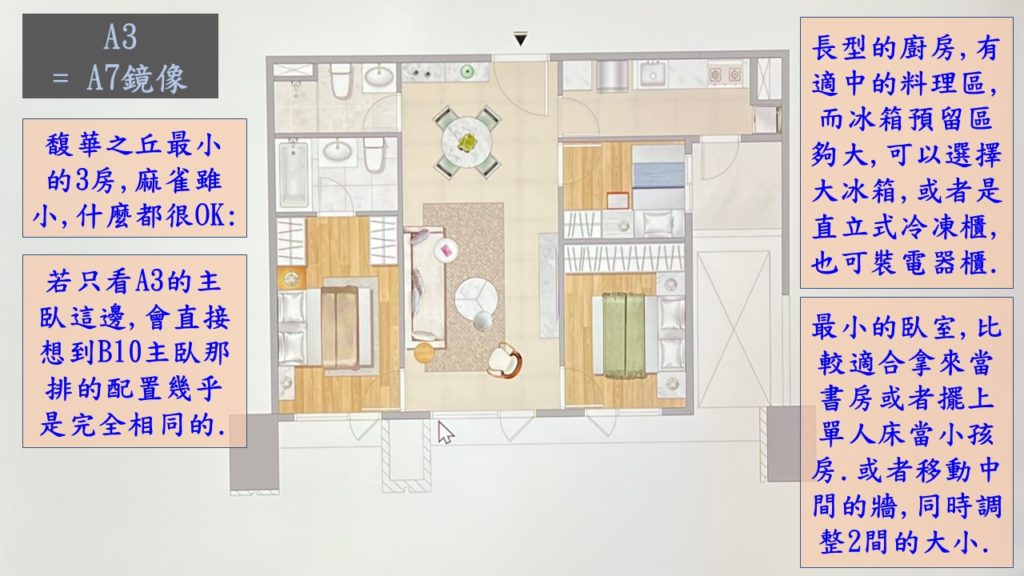 A7戶型是A棟最小的坪數,也是唯一3房的格局,
