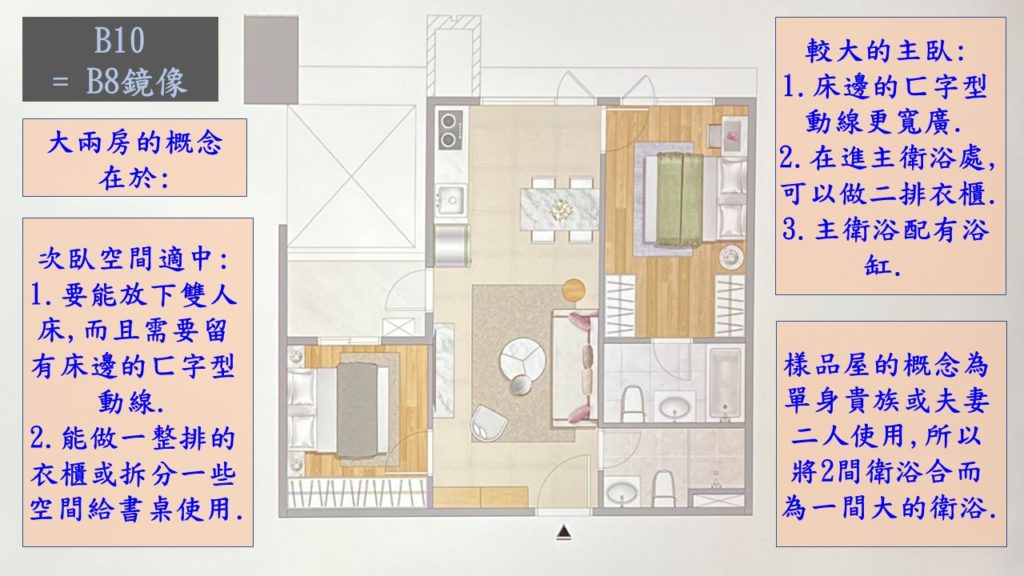 但主衛浴的部分有提供浴缸,但並非像是B1戶型的四件式衛浴。