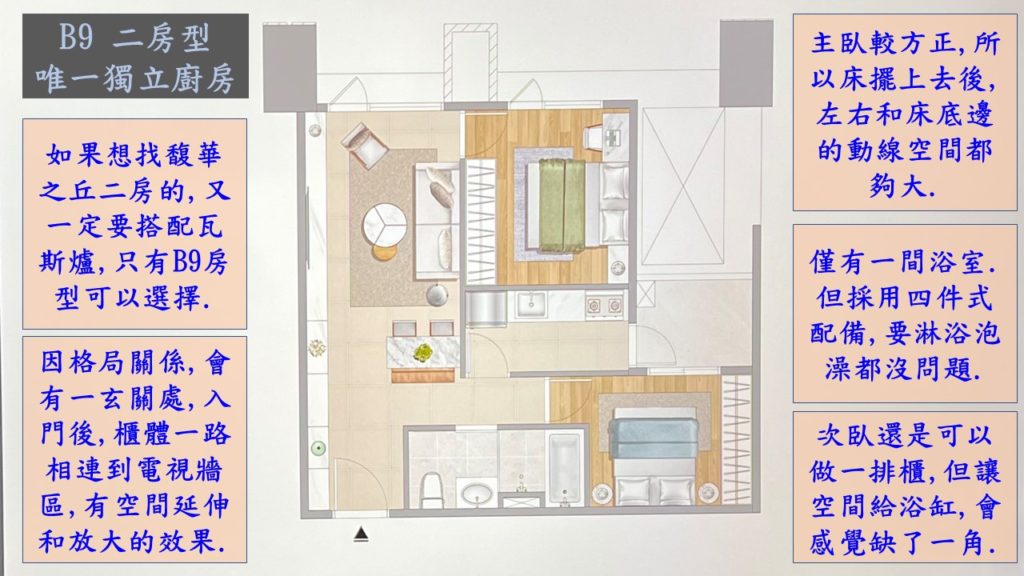比較需要注意到2房B動的廚房是僅有B9戶是使用瓦斯管線的,
