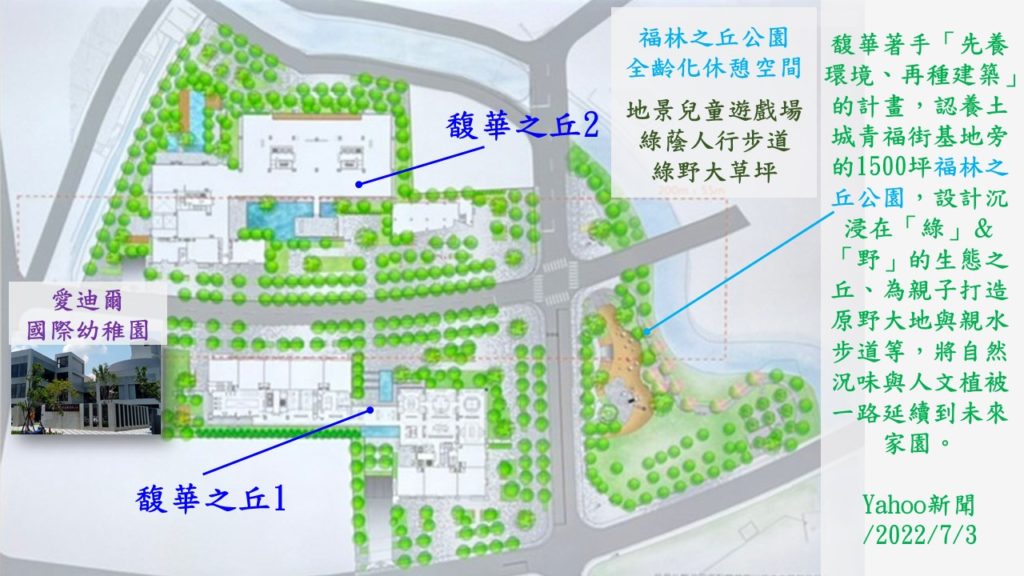 馥華之丘在下面這張圖看起來就好像座落在充滿綠意的樹林裡. 它的1期,2期與旁邊認養的福林之丘公園,將會是六七千坪的共榮空間.
