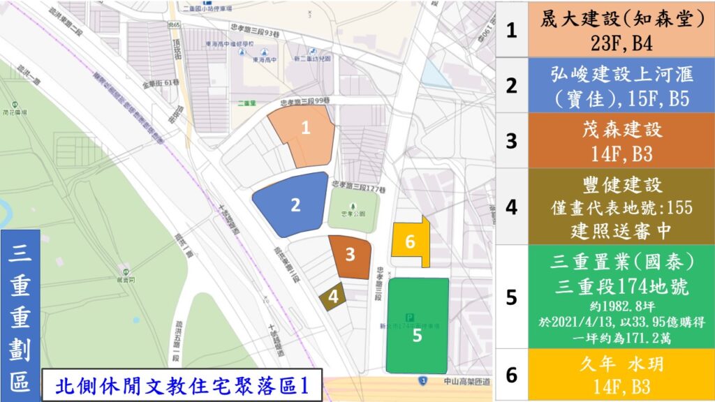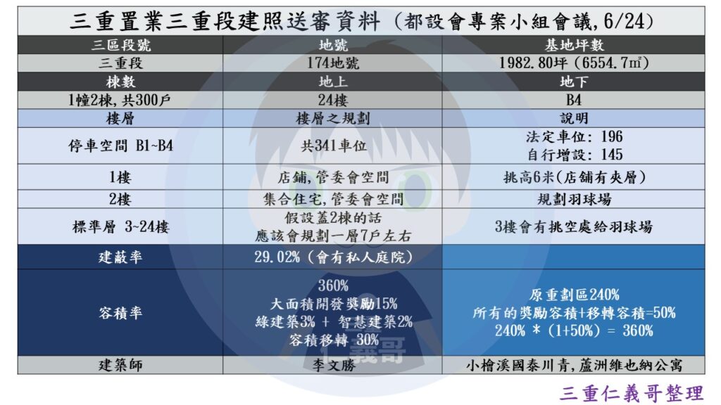 0707三重區建照掛件情報國泰去年在三重買的三重段174地號,今年1月底,就將該土地正式賣給三重置業後,仁義哥就一直在關注其後續發展.三重置業也終於在5/27正式建照掛件送審,也到了6月底,才可窺看到都審內容.因為文長,所以仁義哥幫大家整理了一下,方便參考.但若想知道全文內容,請自己到新北城鄉局網站下載PDF檔.Remarks: 三重置業是國泰與台灣三井不動產合資的公司.因為停車入口規劃會有問題,再加上容積移轉必需花時間核算所以仁義哥推估這個建照下來可能要5-6個月,大家等年底看看囉.