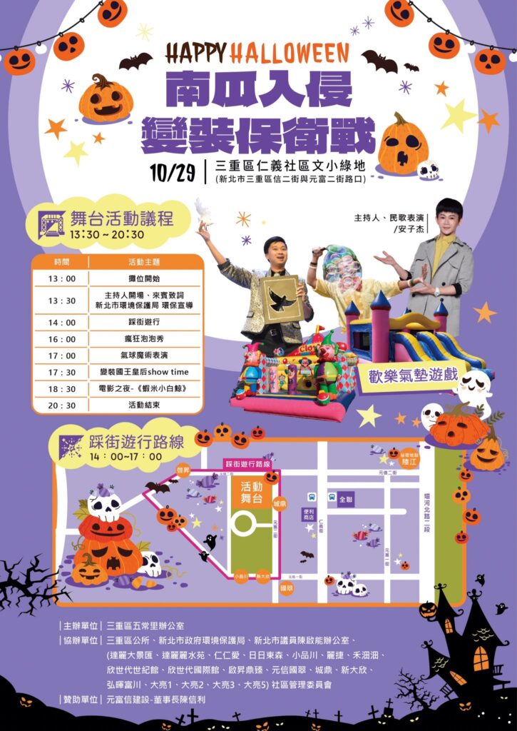 20231029仁義萬聖節 仁義哥今天要來幫忙宣傳和發佈活動消息囉:仁義重劃區第二屆萬聖節活動 🎃南瓜入侵~變裝保衛戰🦇 活動日期與時間: 10/29(本週日), 13:30-20:30 今年的活動將從下午於仁義的中央公園開始喔,除了小朋友們喜歡的踩街遊行外,這次還有精彩的表演可以欣賞喔。歡迎所有仁義居民、準居民或者是附近的好鄰居,好朋友,以及目前仍在關注仁義重劃區建案的朋友們;帶著你們的小朋友,穿上最可愛,最古怪,最有趣的服裝,一起來感受過節的氣氛. 活動的詳細內容以及時間表請參考下方的活動DM ⬇️⬇️⬇️⬇️⬇️⬇️⬇️⬇️ 如果仍有任何問題也可以直接洽詢協辦單位.先預祝此次活動大順利,也希望大家都能有個超級歡樂的萬聖節.