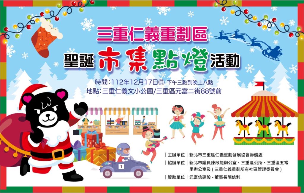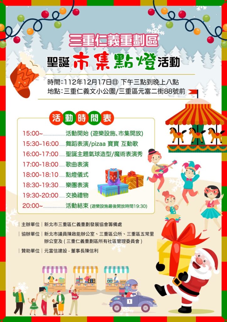 20231217仁義聖誕市集點燈囉 不知不覺今年又來到了尾聲了啦,2023仁義聖誕市集也將在本週日要華麗登場囉! [活動時間]2023/12/17(星期天) 下午3:00~晚上8:00 聽說這次的聖誕市集還有首次登場的旋轉木馬以及小賽車設施唷,歡迎大朋友帶著小朋友們一起來同樂! 同時仁義哥也很感謝這次舉辦活動的單位們, 每逢節日都能為仁義帶來歡樂與笑聲! 主辦單位:新北市三重區仁義重劃發展協會籌備處協辦單位:新北市議員陳啟能辦公室、三重區公所、三重區五常里辦公室及(三重仁義重劃所有社區管理委員會)贊助單位:元富信建設 – 董事長陳信利 詳細的活動DM就在文章最下方,歡迎大家踴躍參與也預祝大家聖誕節快樂!